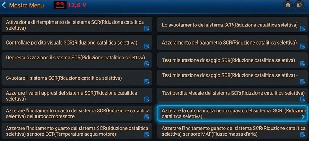 Foto 2: Nella lista che segue scegliere “Azzerare la catena di incitamento guasto del sistema SCR”.